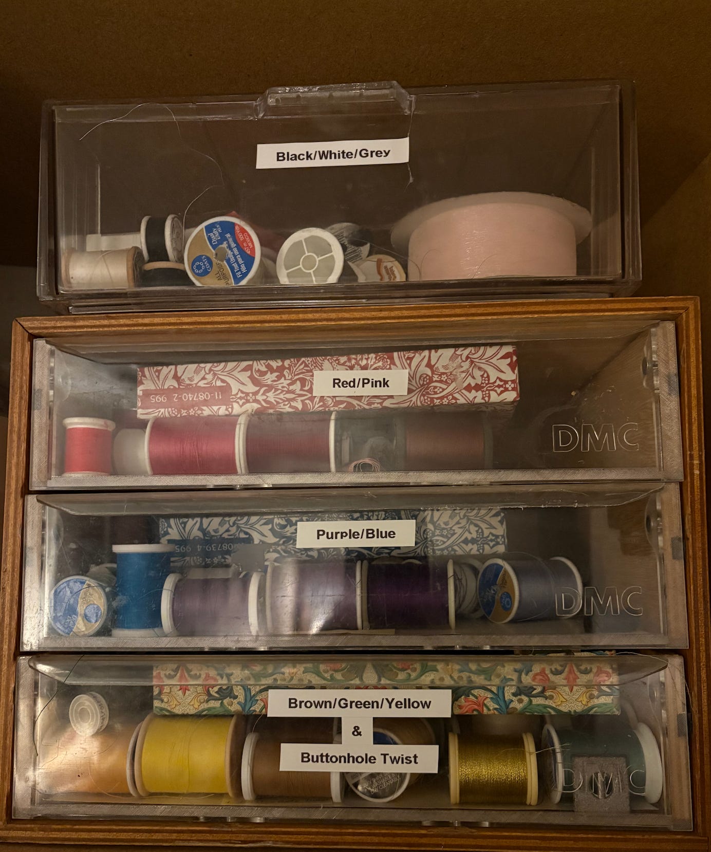 Miss Bettie had organized the spools by color. I opened the base drawer.